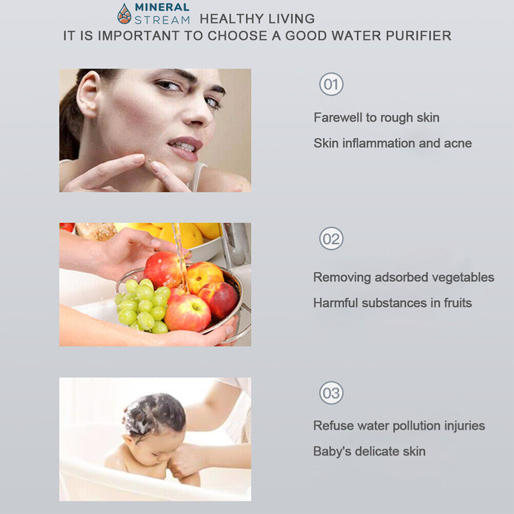 • Reducerer forurenende stoffer: Fjerner op til 99% af skadeligt klor, føre, og andre urenheder.