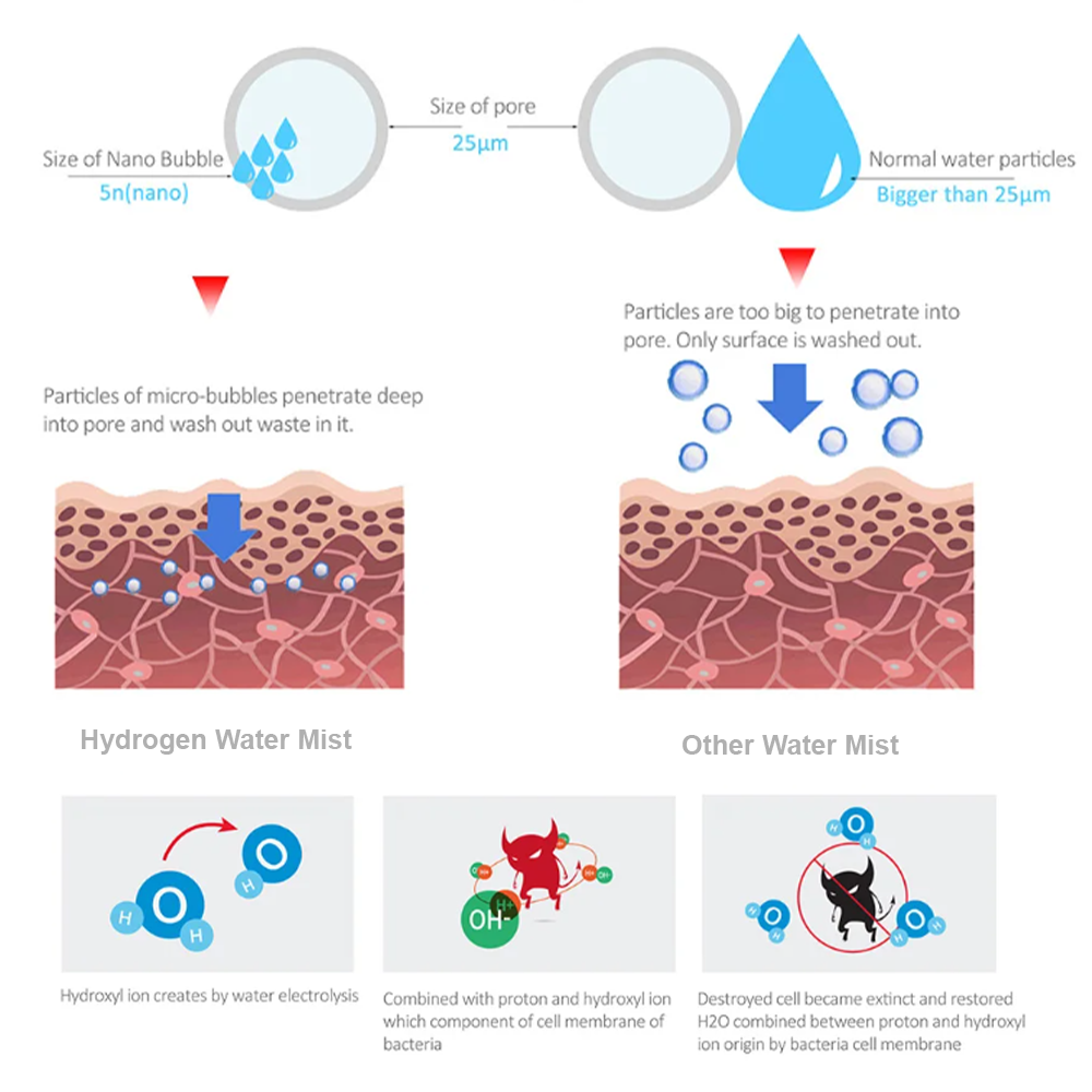 - Mikropartikelfremgang: Nanostore hydrogenbobler i vandsprayen renser og fugter huden i dybden ved at trænge ind i porerne mere effektivt end almindelige vandpartikler.