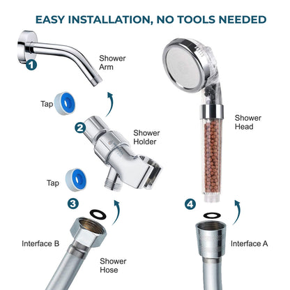 Mineral Stream ionisk brusehoved sparer 30-35% vand, og øger vandtrykket med 200 %. Vores innovative brusepladefunktioner 250 laserskårne huller der presser en lille mængde vand ud med høj hastighed. Således kan du nyde kraftfulde, blide brusere, mens du sparer på elregningen!